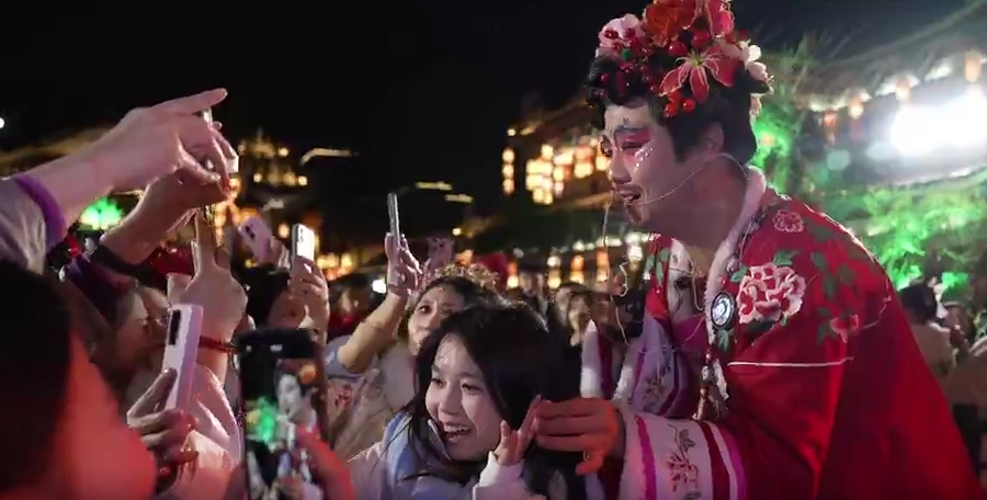 清明上河图园区内,一场沉溺式狂欢大巡游按期表演,如花、狐仙、财神爷等经典影视IP人物络绎其间,与游客近距离互动摄影,光影交错中,似乎让人置身实在的影视片场。